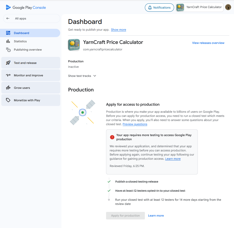 I built YarnCraft to solve actual problems for yarn crafters. The app works. Users who actually need it find it valuable. But Google's process requires me to pretend otherwise, spending weeks manipulating meaningless engagement metrics instead of developing features that matter.