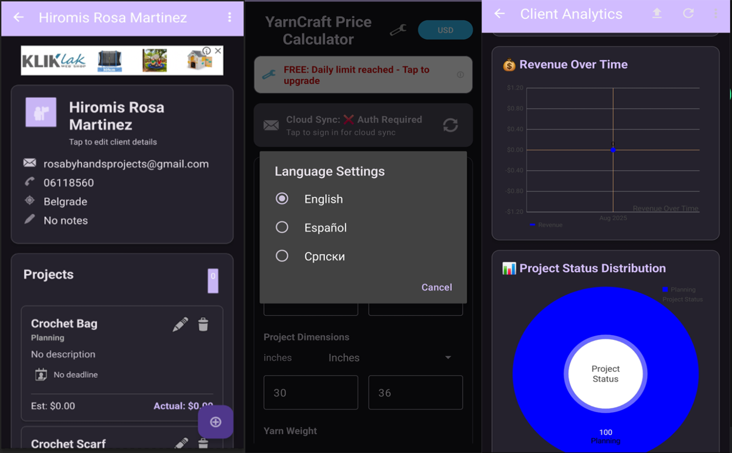 The development part? Straightforward. Converting my Java-React code to Kotlin, polishing the UI, and creating a production-ready app took about a week and a half. The result was YarnCraft: an elegant tool for yarn crafters with three languages, API integration with major yarn retailers, statistics tracking, and features built by an actual knitter for actual knitters.